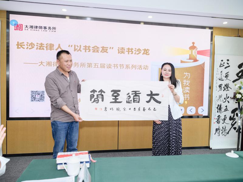 活动开场,大湘律师事务所高级合伙人、主任杜亚萍以“读经典、读跨界、读同行”为题致辞开启读书会讨论。长沙法官文联主席胡军军发言强调“触类旁通对法律人的重要性”。现场艺术家向举办单位赠送《为中华之崛起而读书》《五更鸡》《大道至简》等读书主题书画作品。