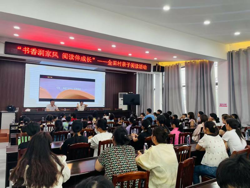 在青瓦白墙的金田农家书屋里,乐声悠扬,书声朗朗,家长和孩子们围坐在一起,共赴一场“悦”读之旅。