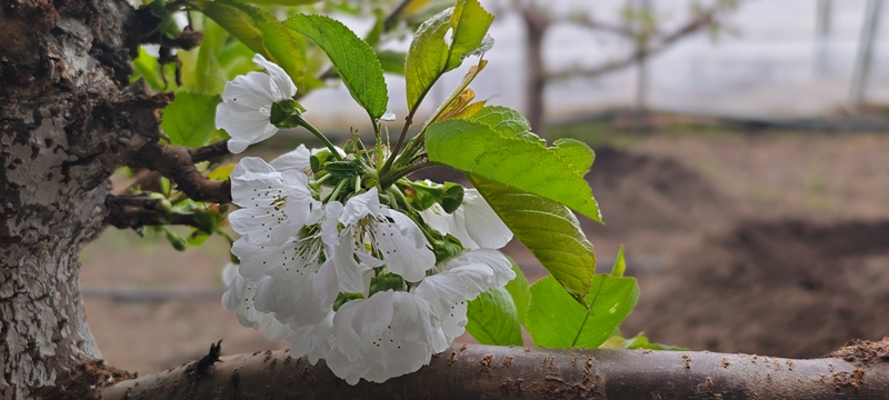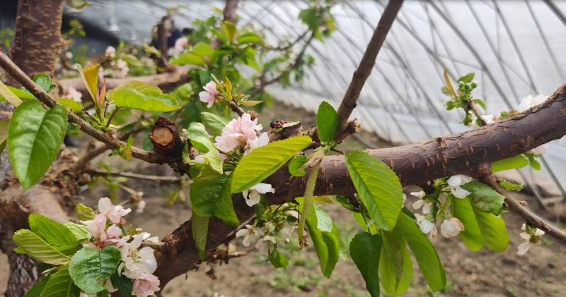 大棚春色关不住,在吸引游客欣赏美景的同时,也孕育着乡村产业振兴的新希望。工人们正加紧对车厘子花进行人工授粉,保障车厘子的品质和口感。目前,车厘子正值盛花期,预计6月可成熟上市。