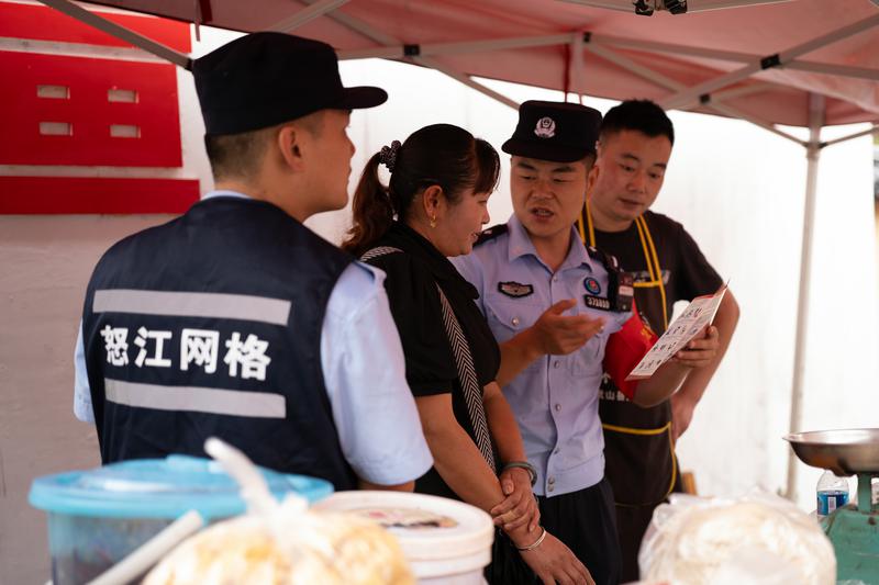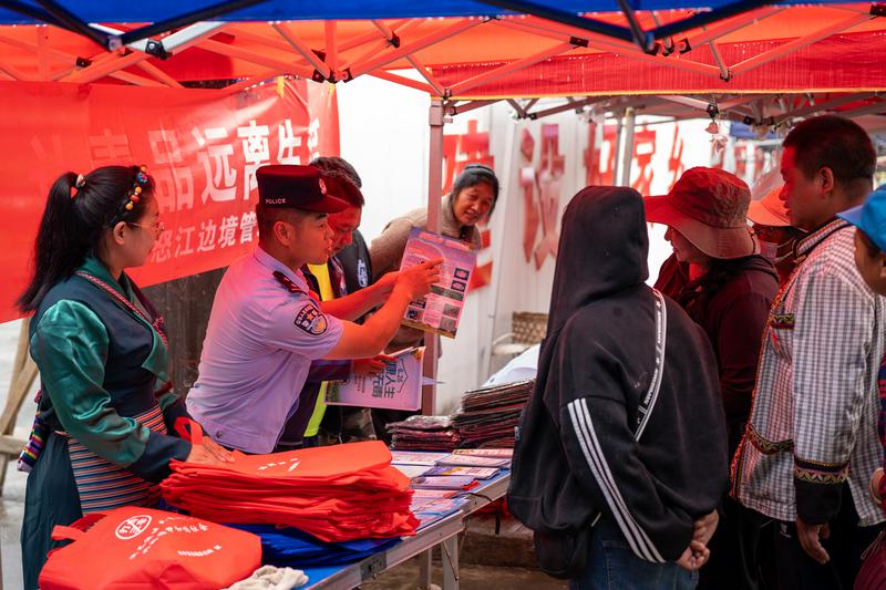 “这是摇头丸,吃了会上瘾……”6月23日,云南怒江丙中洛镇街子天,人潮涌动,热闹非凡。一支由怒江边境管理支队丙中洛边境派出所民警、司法所干部、网格员和怒族志愿者组成的“禁毒小分队”走进集市。他们身着“公安蓝”“司法蓝”“网格蓝”和怒族七彩服饰,成为集市中一道独特的风景线。