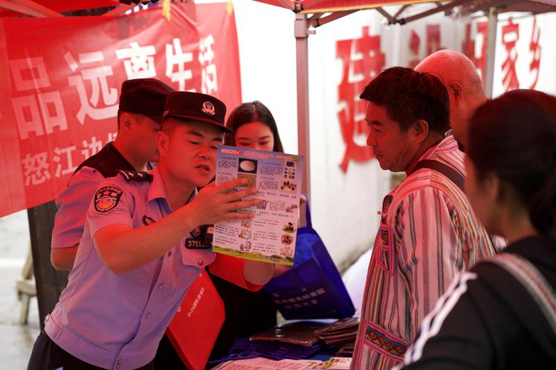 集市中心的宣传点前,“这是伪装成‘奶茶粉’的毒品,年轻人千万要警惕!”民警樊志鹏手持仿真毒品模型高声讲解。“阿普阿嬷们记住,陌生人给的药丸不能乱吃!”身着怒族盛装的志愿者李月梅用流利的怒语补充道。赶集的群众驻足聆听,反响热烈。