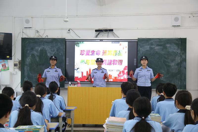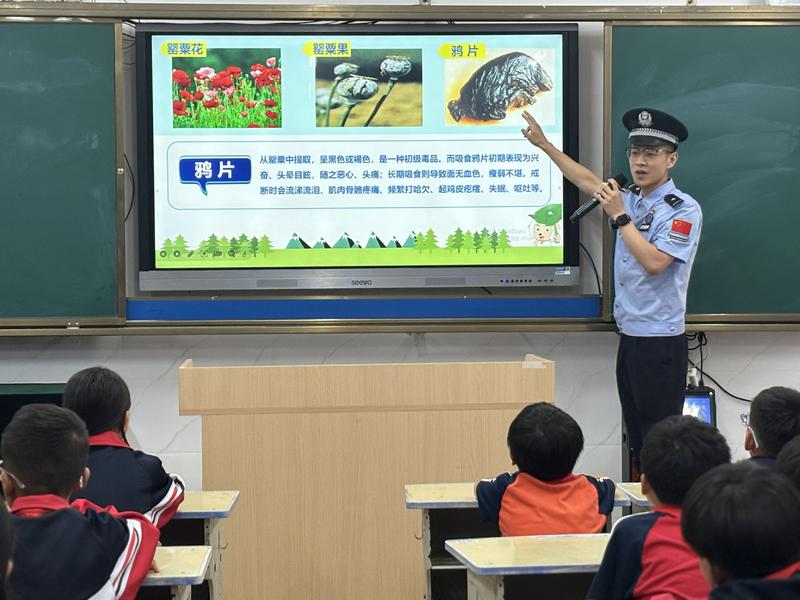 在安宁乡九年一贯制学校,安宁边境派出所民辅警通过 “案例剖析 互动问答”的形式开展宣传。“小明因为吸食毒品导致肾衰竭,这说明了什么?”“吸毒会损害身体健康!”课堂上,民警结合本地真实涉毒案件,用通俗易懂的语言剖析毒品对个人、家庭和社会的危害。同时,借助禁毒公益宣传片的力量,并结合“禁毒知识大闯关”的有奖问答活动,使同学们在轻松愉快的氛围中学习并掌握禁毒知识