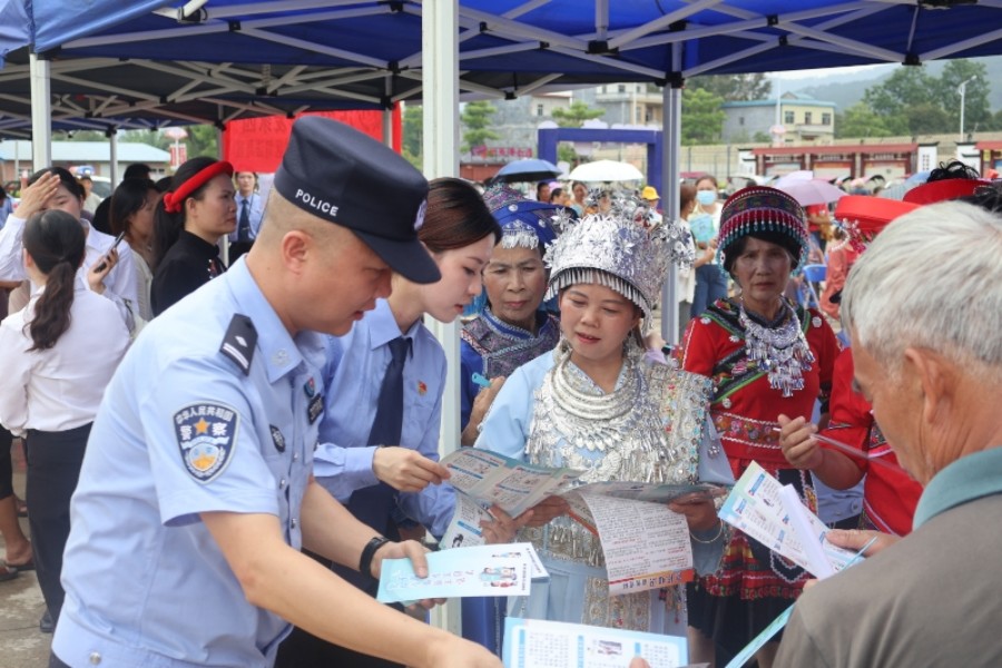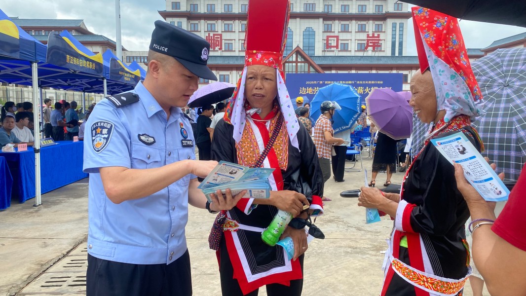 近日,峒中口岸迎来一场别开生面的法治“集市”,峒中边境派出所紧抓自治区司法厅主办的2025年广西“民族法治大篷车边疆行”活动契机,携手峒中镇政府等单位共同开展法治宣传。