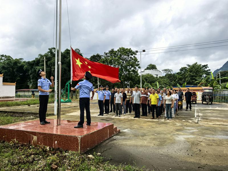 紧接着,全体人员来到村委广场,整齐列队,举行升国旗仪式。由派出所民警担任升旗手,迈着整齐有力的步伐护送国旗入场。随着激昂的《义勇军进行曲》响起,五星红旗冉冉升起,全体人员庄严肃立,行注目礼、奏唱国歌,深情表达对祖国的热爱和对守护边疆的坚定信念。