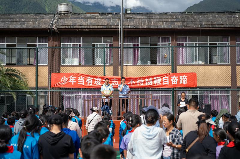 操场活动同样精彩纷呈。民警联合交警在丙中洛小学操场上组织了一场别开生面的法治安全实践活动。他们设置了模拟交通场景,让学生们亲身参与,扮演不同的交通角色,切身体验遵守交通规则的重要性;还开展了防身术教学,向学生们传授了一些简单实用的防身技巧,以应对可能出现的危险情况。
